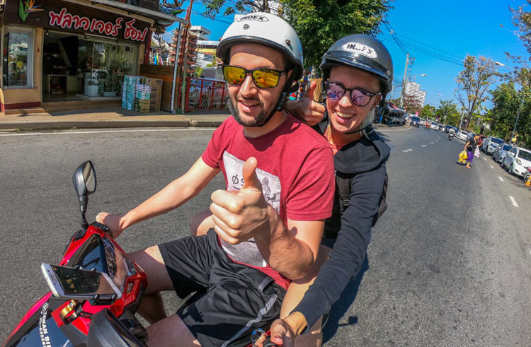 Well, enough about the food and shopping! The biggest and most famous attraction is located about ten kilometres out of town. Doi Suithep is a temple at the top of a mountain, at the end of the winding and very steep road. How to get there? Definitely the easiest, most convenient and comfortable way is to get yourself a scooter and just drive. But remember that, when you reach the top, there is still an ascent of about 300 steps! Admission fee is free for locals, but foreigners need to pay 30 THB. We don’t need to tell you, that is nearly impossible to convince the security guy that you are Thai, right? 😃